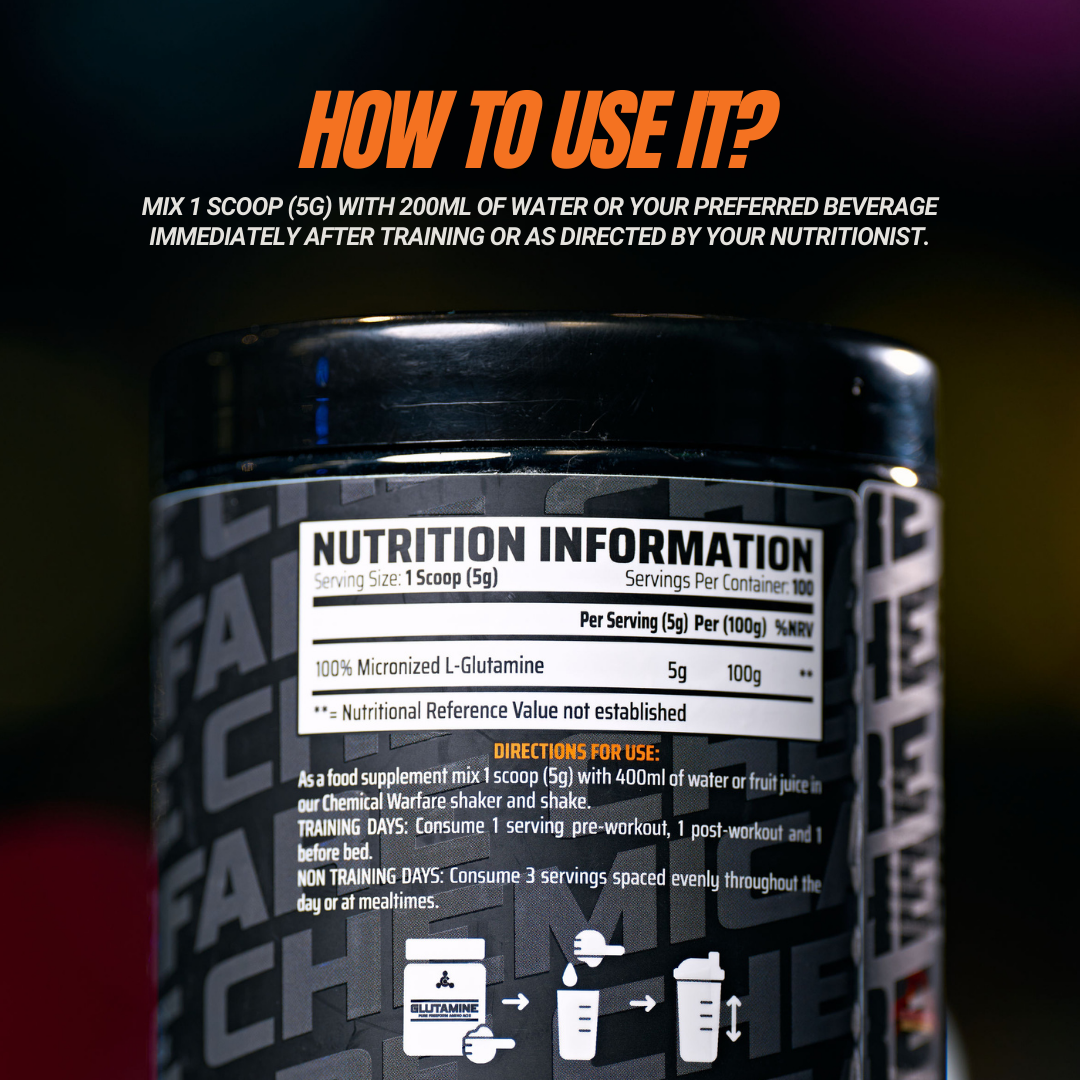 • 100% Pure Micronised Glutamine – Superior absorption and bioavailability.